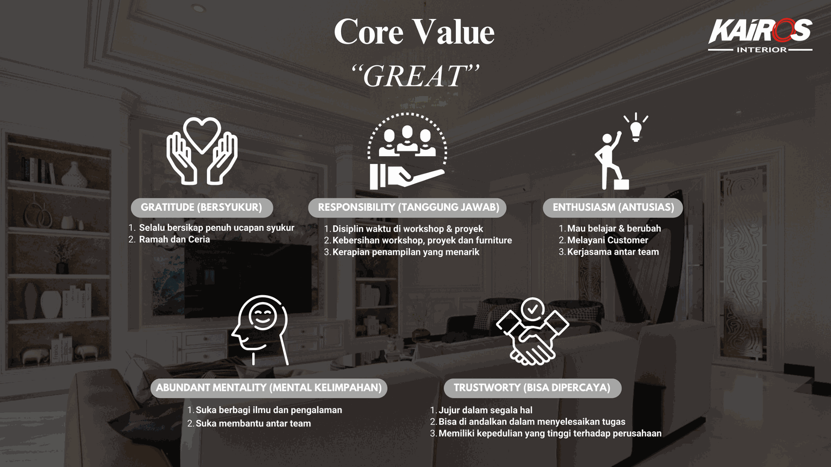 KAIROS INTERIOR services are provided with ISO 9001 certificate. We have very detailed and neat work system such as concept, planning, physical work project, layout making, furniture making, electrical planning, accessories selection, curtains & vitrase, ceiling planning, to wall planning. KAIROS INTERIOR work area covers all of Indonesia. With our remarkable experience, our value, and our system KAIROS INTERIOR ready to be your One Stop Solution for Your Blissful HOME.
